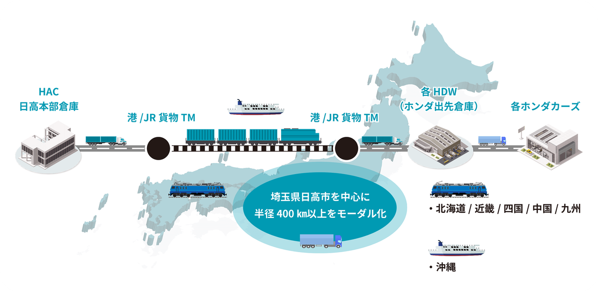 ホンダ車を購入した際に取り付ける用品(フロアマット/カーナビ等)を全国の出先倉庫へ輸送する手段として、トラックからモーダルシフトすることで環境に配慮し、ドライバー不足への対応を行っています。